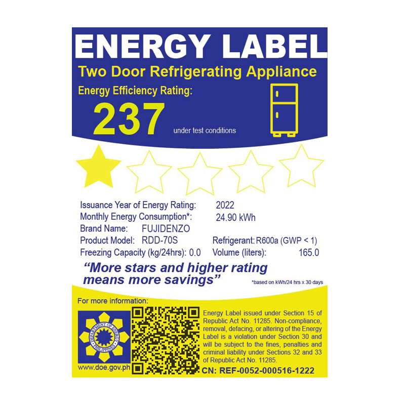 In conclusion, the Fujidenzo RDD-70S 7.0 cu.ft. two door refrigerator is a great choice for those who want an efficient and convenient way to store their food and drinks. With its energy-efficient compressor, extra large freezer space, 5-year warranty on the compressor, and bottom vegetable crisper, you can be sure that you’re making a wise investment.